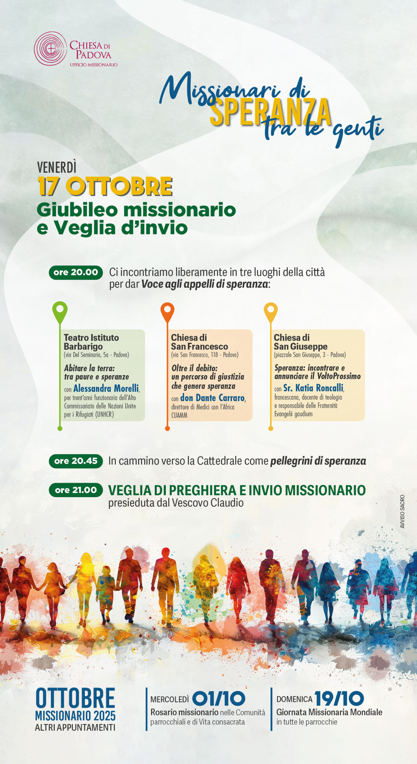 Venerdì 17 ottobre 2025, a ridosso della Giornata missionaria mondiale (domenica 19 ottobre), si celebrerà in Diocesi il Giubileo missionario accompagnato dallo slogan “Missionari di speranza tra le genti”. Si svolgerà in contemporanea in tre diversi luoghi della città: il teatro dell’Istituto Barbarigo, la chiesa di San Francesco e la chiesa di San...